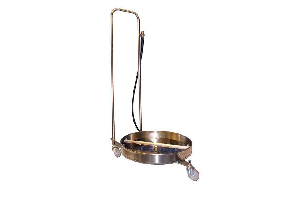Hydro Tek is pleased to announce the NEW Undercarriage Washer. Clean the undercarriage of trucks, boats, and farm equipment with the new Undercarriage Washer. Attach this accessory to a hot or cold pressure washer to effortlessly remove grime from the underside of vehicles and equipment. If you need to clean concrete, simply reverse the casters and flip the deck over to be used as an efficient flat surface cleaner. Rust resistant, stainless steel construction, with an aluminum spray bar, to ensure a long life of use even in corrosive environments.